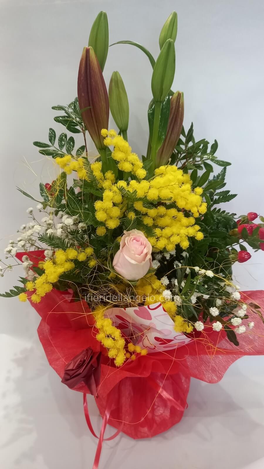 Regala o regalati un momento di gioia con il nostro bouquet: la qualità artigianale dei fiori parla da sé.Bouquet con riserva d'acqua ,non necessita di vaso . Lilium,rose fiori misti e mimose